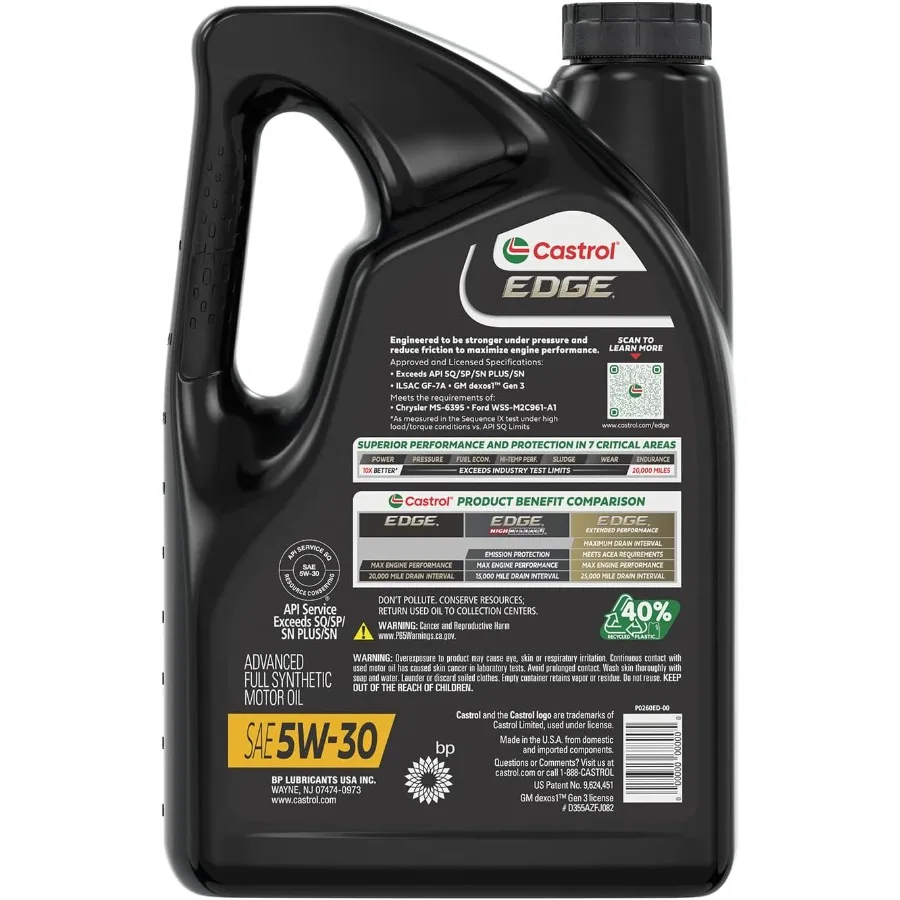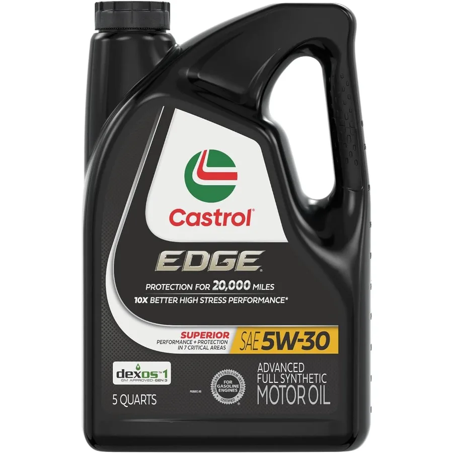 This EDGE 5W-30 full synthetic motor oil provides superior protection for high-performance engines. Formulated to perform in extreme temperatures and heavy-duty driving conditions. Reduces engine wear, deposits, and friction for prolonged engine life. Enhances fuel efficiency and smooth engine operation. Ideal for cars, trucks, and SUVs requiring high-quality synthetic oil. The 5-quart pack is convenient for multiple oil changes. Durable construction ensures consistent performance under high stress. Helps maintain engine cleanliness and reduces noise. Suitable for modern engines with advanced technology and turbochargers. Keep your engine running at peak performance with this advanced synthetic motor oil.