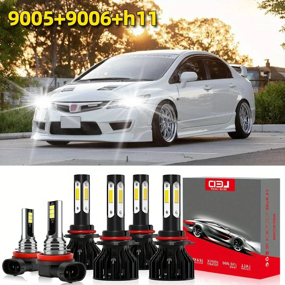 These LED headlight and fog bulb combos are designed specifically for Honda Civic models from 2007 to 2015. The set includes high and low beam bulbs along with fog lights for complete illumination. Each bulb produces bright 6000K white light for enhanced visibility and safety. With 500% brighter output than standard halogens, night driving is clearer and safer. Plug-and-play design allows easy installation without wiring modifications. Compatible with 9005, 9006, and H11 sockets for direct replacement. Durable construction ensures long-lasting performance and resistance to vibration. The LED technology reduces power consumption while maintaining high output. Ideal for improving both appearance and functionality of your vehicle. Upgrade your Honda Civic with this reliable and bright LED lighting combo.