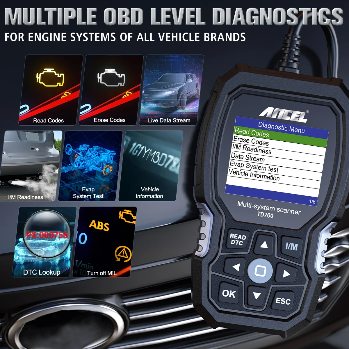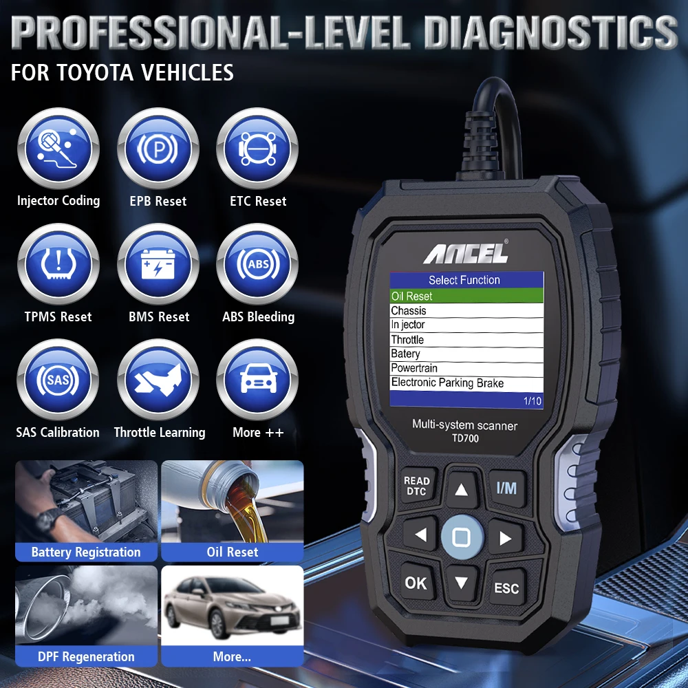 The ANCEL TD700 OBD2 scanner is designed for Toyota, Lexus, and Scion vehicles. It provides full system diagnostics including engine, ABS, TPMS, transmission, and more. Supports TPMS relearn and transmission reset functions for precise maintenance. Reads and clears fault codes to help identify vehicle issues quickly. User-friendly interface makes operation straightforward for professionals and enthusiasts. Compatible with most Toyota, Lexus, and Scion models. Helps prevent costly repairs by enabling early fault detection. Compact and durable design ensures long-term reliability. Bluetooth and USB connectivity allow easy updates and data export. Keep your vehicle optimized and maintained with this all-in-one OBD2 diagnostic tool.